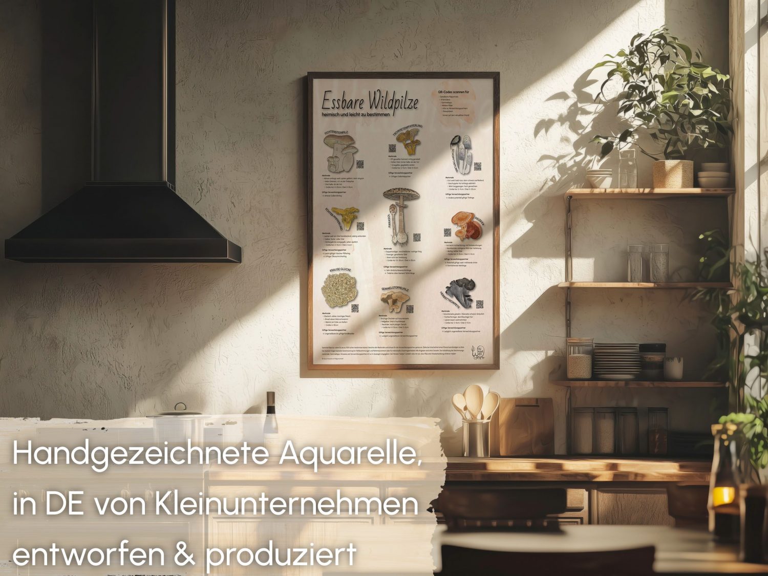 Meine detailreichen Aquarelle machen das Poster zu einem echten Blickfang in jeder Wohnung, Küche oder im Zimmer. Künstlerisch und Lehrreich in einem- lerne die wichtigsten Einsteigerpilze ganz nebenbei im Alltag.